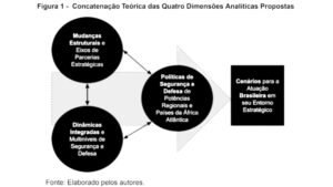 A quarta dimensão teórico-analítica, situa a compreensão da realidade no contexto social em que a pesquisa se insere, qual seja, da sua relevância para a Defesa Nacional do Brasil e a estabilidade de seu Entorno Estratégico. Cabe aqui, portanto, o mapeamento de riscos e a produção de cenários relevantes que envolvem atuação brasileira em eventos capazes de afetar direta e indiretamente o seu Entorno Estratégico. Nas condições da atuação brasileira, importam sobretudo práticas alinhadas à política externa do país, tais como a diplomacia de segurança e defesa, cooperação técnica e missões de paz (VISENTINI, 2016).