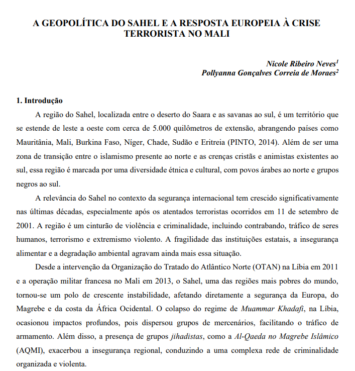 Artigo: A geopolítica no Sahel e a resposta europeia à crise terrorista no Mali