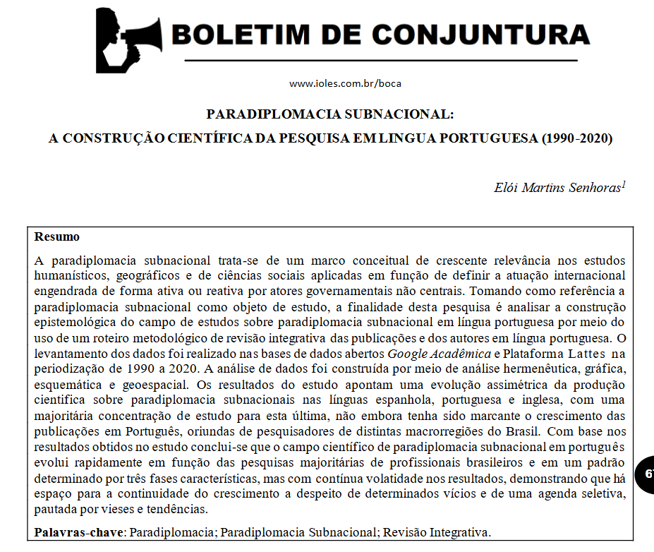 Artigo: Paradiplomacia Subnacional: A Construção Científica da Pesquisa em Língua Portuguesa (1990-2020)